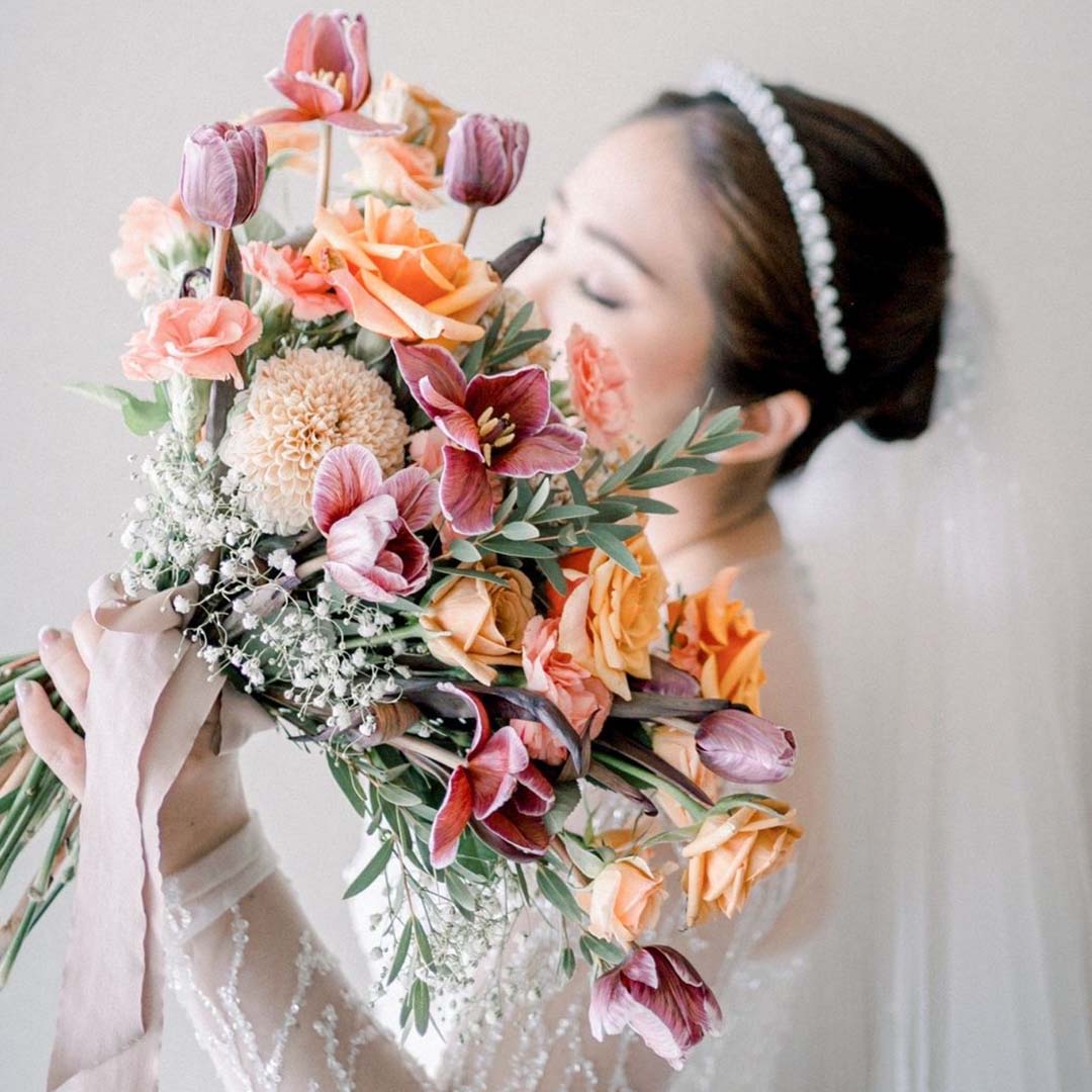 Mixed imported and local flowers in autumn colors, wide hand tied arrangement. Get free groom’s boutonniere for every purchase.